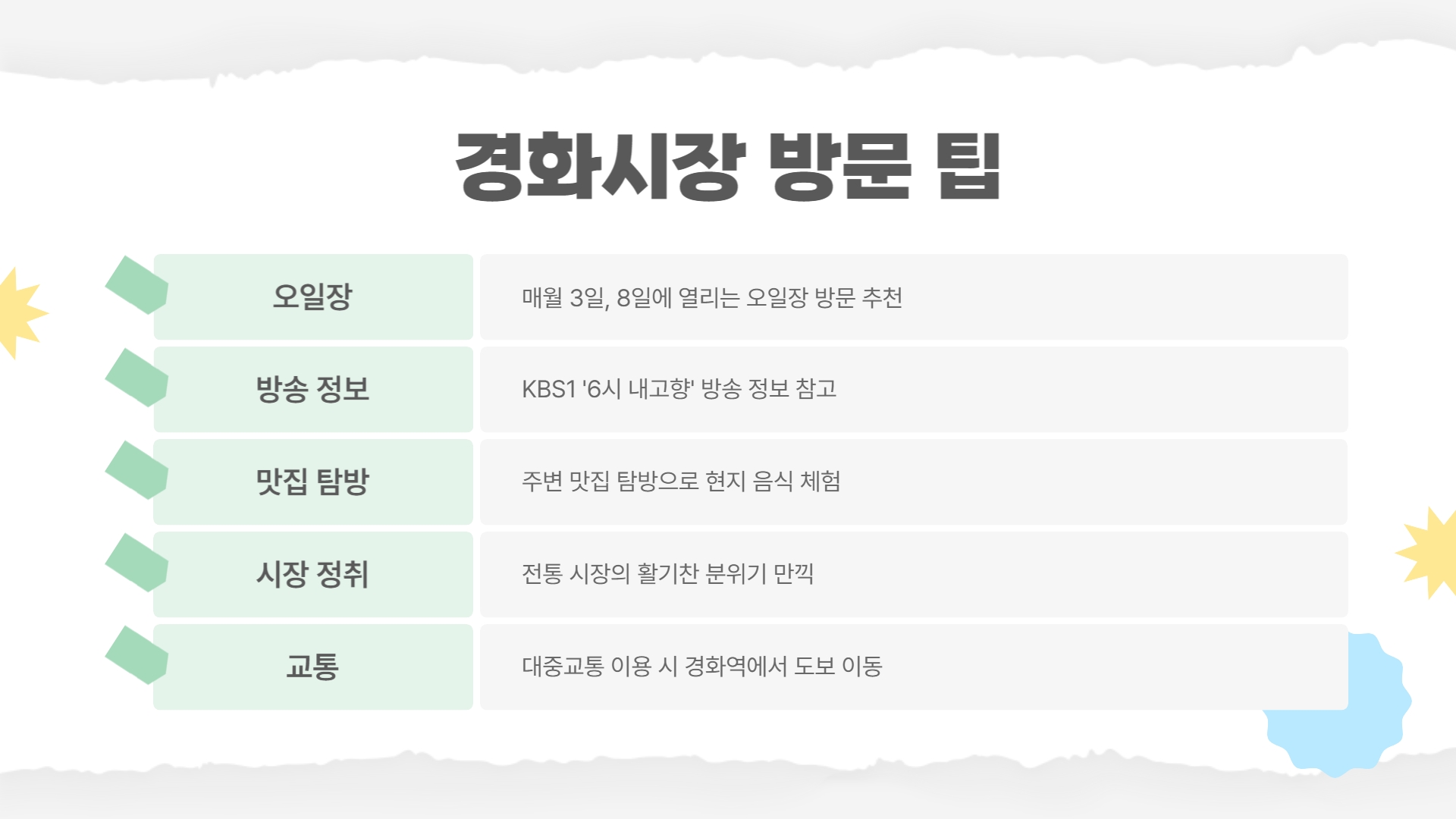 - KBS1의 [6시 내 고향] 방송을 통해 소개된 명소와 먹거리를 참고하면 더욱 알찬 시장 투어가 가능합니다.