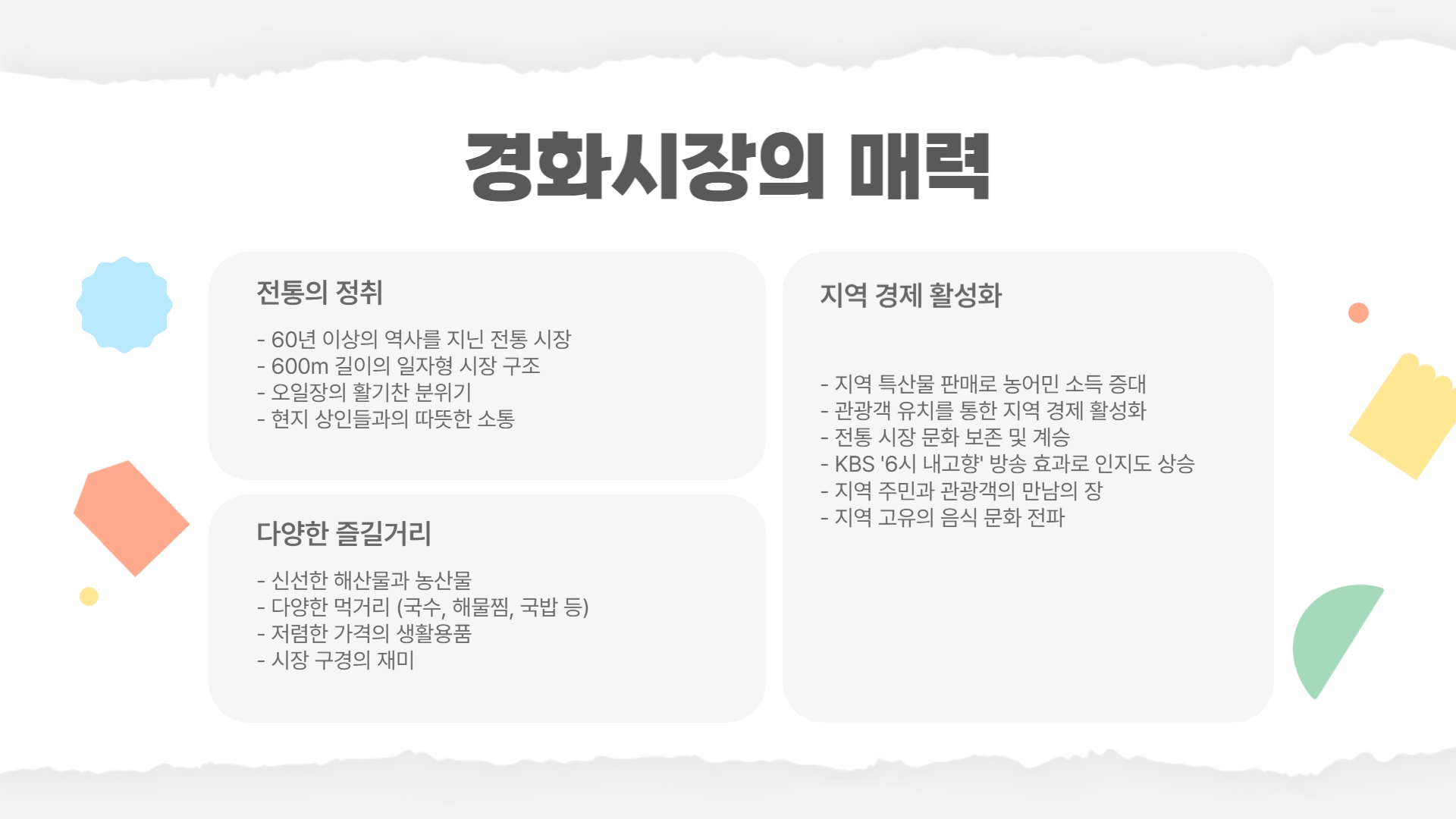 경화시장은 전통적인 시장의 정취와 함께 다양한 먹거리와 즐길 거리를 제공하는 매력적인 장소입니다. 특히, 방송을 통해 알려진 만큼 더욱 많은 사람들이 찾고 있는 핫플레이스가 되었으니 꼭 한번 방문해 보세요!