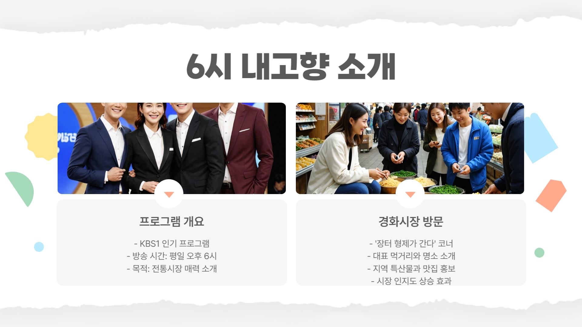 KBS1의 인기 프로그램 6시 내 고향은 매주 월~금요일 오후 6시에 방송되며, 전통시장의 매력을 알리는 다양한 코너를 운영하고 있습니다.