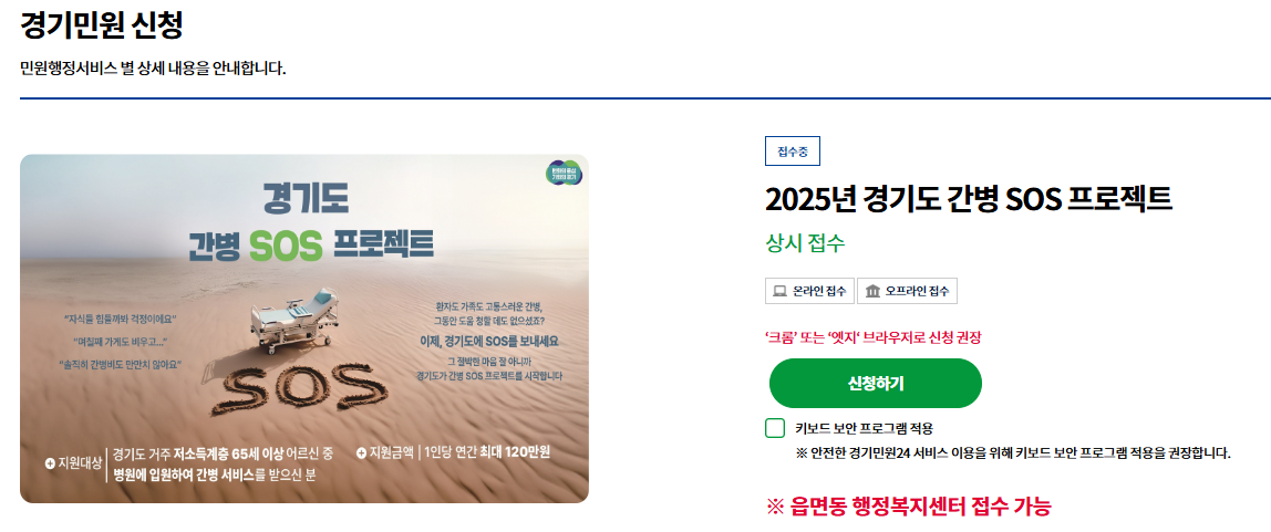 1. 먼저 링크를 통해 경기민원 24 누리집 홈페이지로 접속합니다. 2025년 경기도 간병 SOS 프로젝트 신청하기 버튼을 클릭합니다.