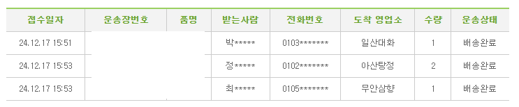 조회한 날짜의 정보가 나타납니다. 운송상태를 확인하시면 되겠습니다. 발송일 접수된 시간과 배송이 완료되었는지 영업소에 도착하였는지 정보가 나타납니다.