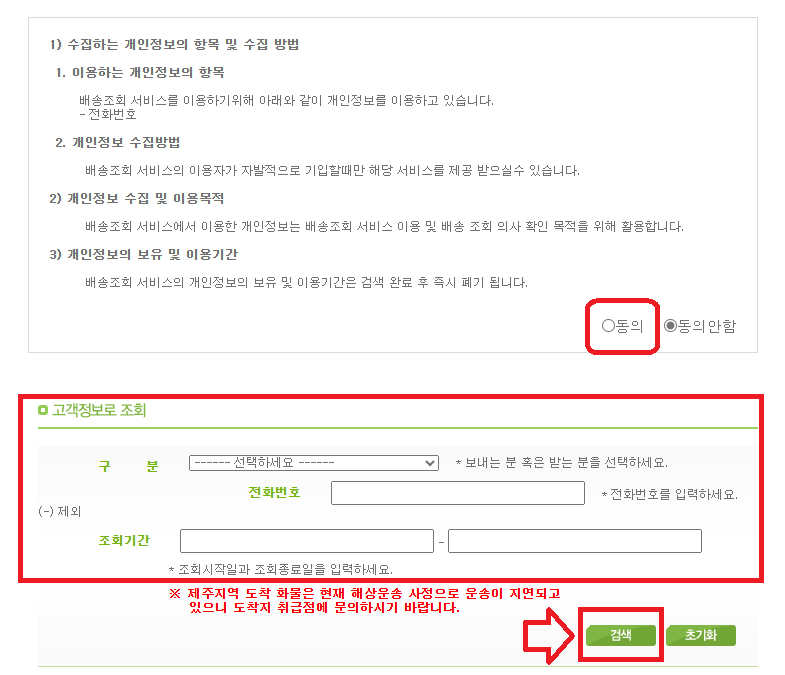 정보 수집 창이 나타납니다. 개인정보 사용에 대한 내용을 확인하고 동의 항목에 체크를 해줍니다. 그리고 아래쪽에 고객정보로 조회 항목에 정보를 입력하여 줍니다. 구분은 보내는 분 혹은 받는 분의 정보로 검색할 것인지를 선택하는 곳입니다.