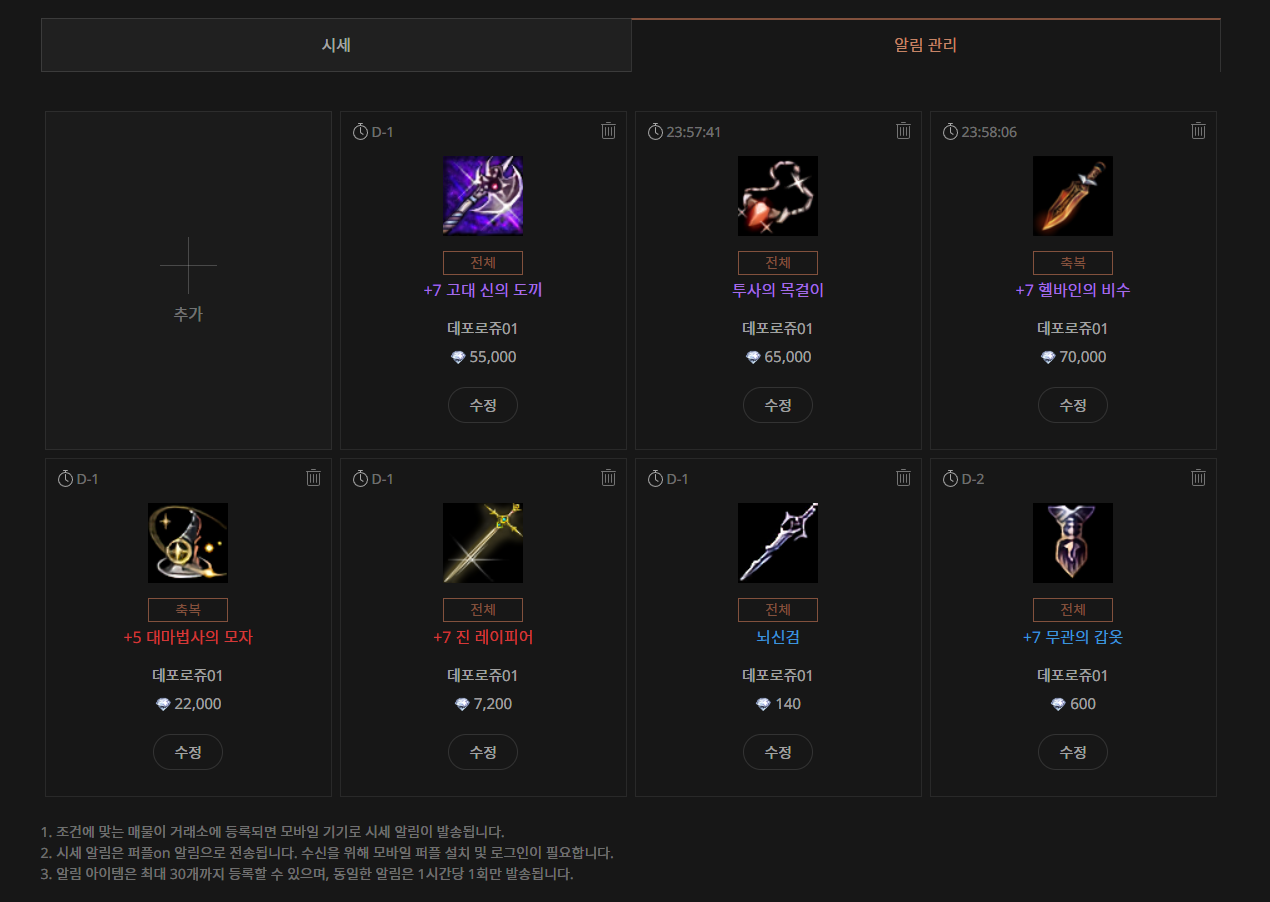 또한, 알림 카드는 계정당 최대 30개까지 등록 가능하며 수정 및 삭제도 용이해 체계적인 관리가 가능합니다. 이러한 기능은 게임 내 경제 활동을 효율적으로 관리하려는 사용자들에게 필수적입니다.