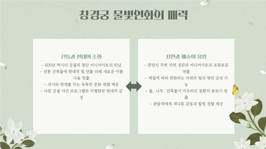 다른 궁궐 야간 프로그램인 경복궁 별빛야행이나 덕수궁 석조전과 달리, 창경궁 물빛연화는 미디어아트와 자연경관이 어우러져 더욱 몰입감 있는 경험을 제공합니다. 특히 춘당지 주변의 테마별 연출은 전통과 현대가 조화를 이루며 관람객들에게 색다른 감동을 선사합니다.