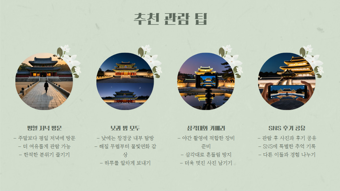 - 낮에는 창경궁 내부를 탐방하고, 해질 무렵부터 물빛연화를 감상하면 하루를 알차게 보낼 수 있습니다.