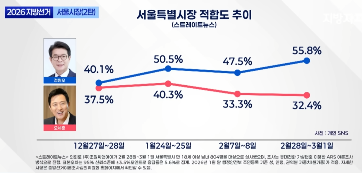 2026년 지방선거의 꽃, 서울시장 선거판이 요동치고 있습니다. '불패 신화'를 써 내려가던 오세훈 서울시장이 5선 고지를 앞두고 생애 가장 가혹한 겨울을 맞이하고 있습니다. 반면, 성동의 신화를 쓴 정원오 전 구청장은 거침없는 상승세로 대세론을 굳히는 형국입니다.