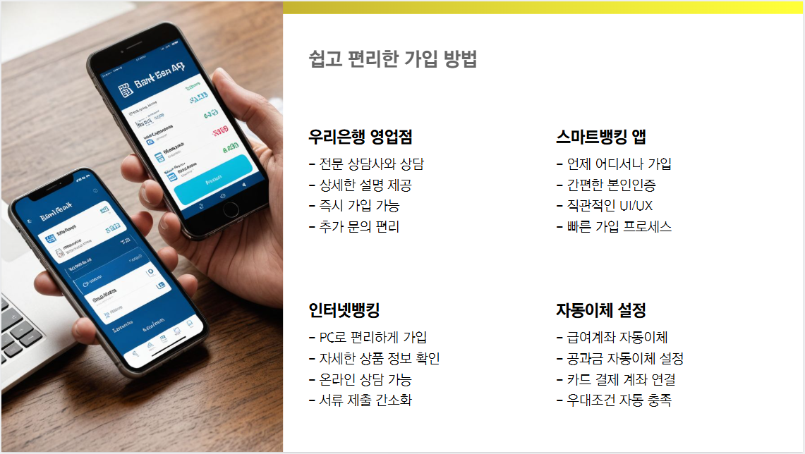 - 스마트뱅킹 앱 이용: 언제 어디서나 스마트폰으로 몇 번의 터치만으로 손쉽게 가입하실 수 있습니다.