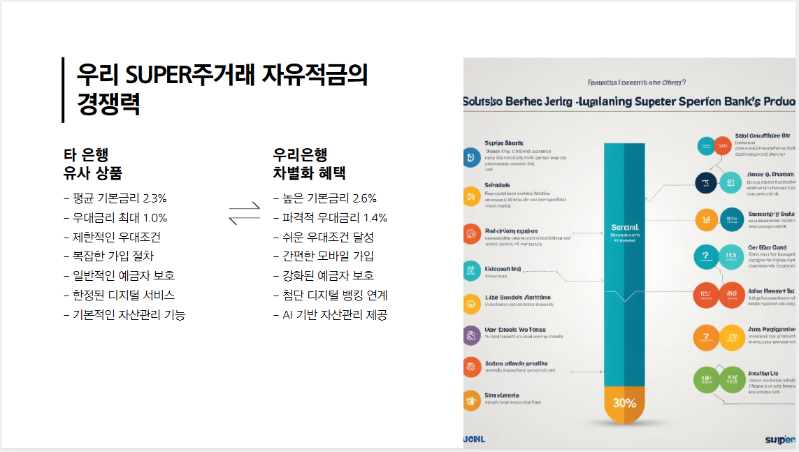 여러분께서 적금 상품을 선택하실 때 가장 중요하게 고려하시는 요소들이 무엇일까요? 바로 든든한 안정성, 매력적인 금리, 그리고 다양한 혜택일 것입니다. 우리 SUPER주거래 자유적금은 이 세 가지 핵심 요소를 완벽하게 갖춘 프리미엄 금융 상품입니다.