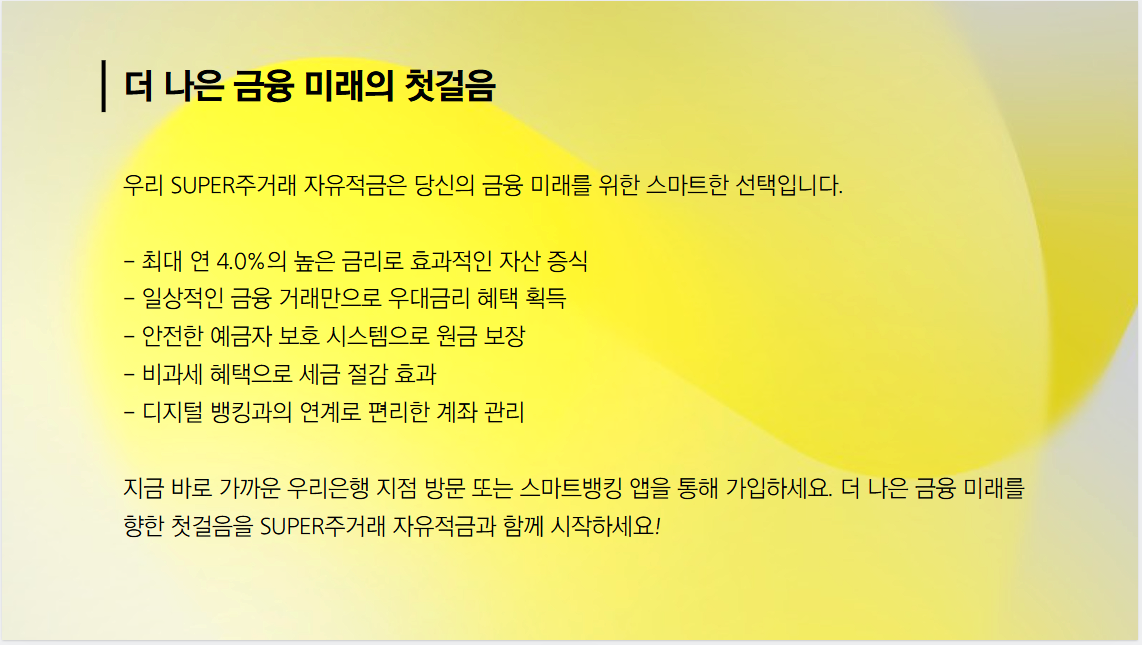"평범한 금리와 단순한 적금 상품에 실망하셨나요? 이제 그런 고민은 모두 잊으세요! 우리 SUPER주거래 자유적금과 함께라면 당신의 일상적인 금융 생활이 특별한 자산 관리의 기회로 바뀝니다."