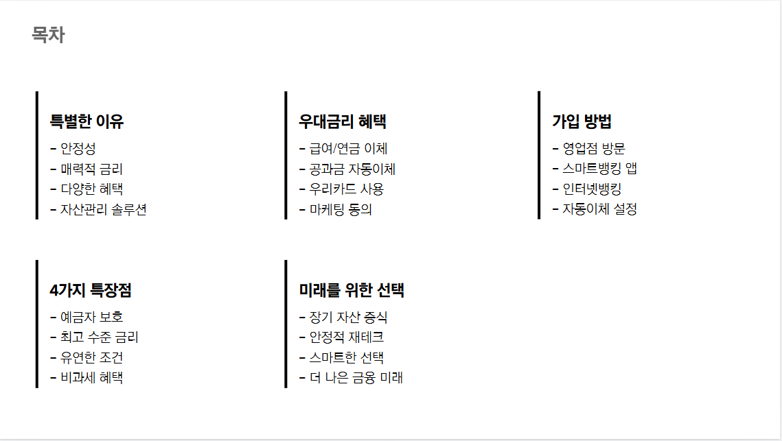 - 우리은행 영업점 방문: 가까운 영업점을 방문하시면 전문 상담사가 상세히 안내해 드립니다.