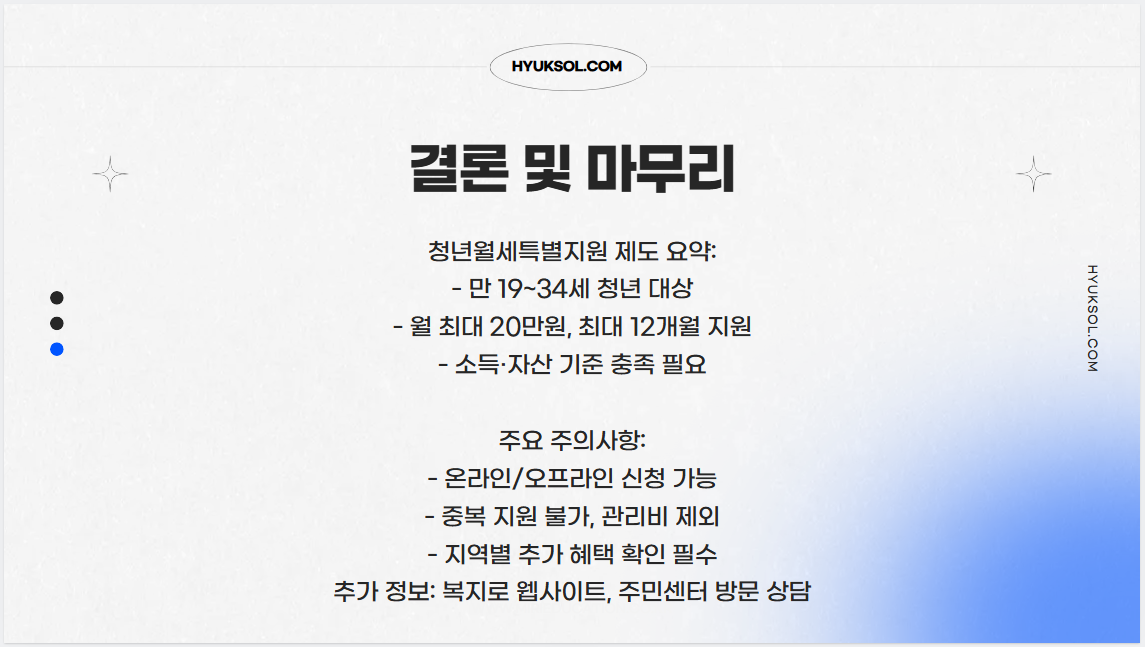 청년월세특별지원은 청년들이 안정적으로 생활할 수 있도록 돕는 중요한 제도입니다. 특히 월세 부담이 큰 수도권 거주자뿐 아니라 지방 청년도 혜택을 받을 수 있으니, 자격 요건을 꼼꼼히 검토하고 기한 내에 꼭 신청하시길 바랍니다.