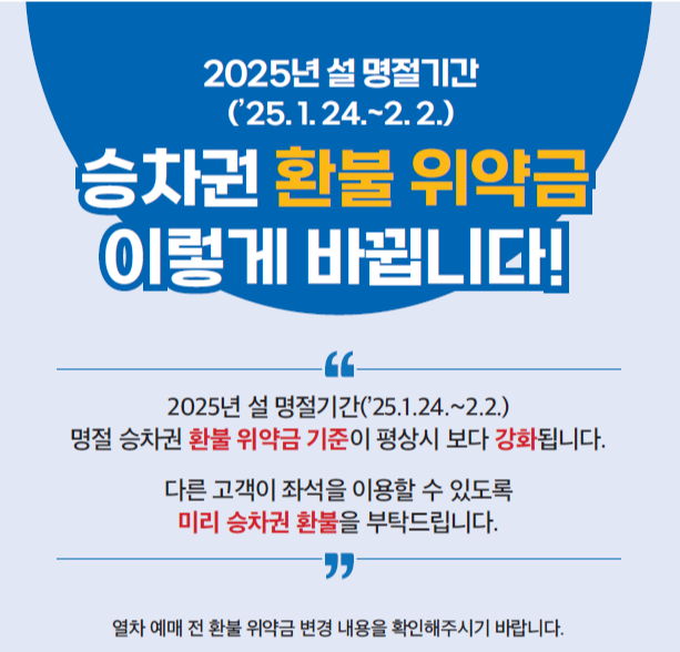 이번 조치는 설 명절 기간 동안 열차 이용의 효율성을 높이고 국민 불편을 최소화하기 위한 방안입니다. 변경된 환불 규정을 잘 숙지하여 불필요한 비용 부담을 줄이고, 모두가 편리하게 고향 방문을 할 수 있기를 바랍니다.