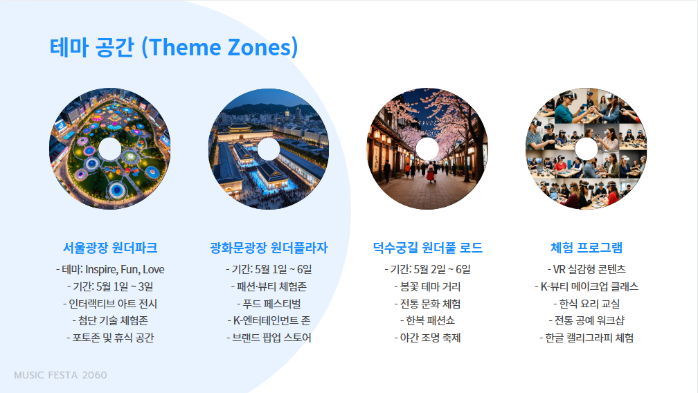 축제 기간 동안 서울 곳곳에 특별한 테마 공간이 마련됩니다. 각 공간은 독특한 콘셉트로 꾸며져 있어 방문객들에게 다양한 즐거움을 선사합니다.
