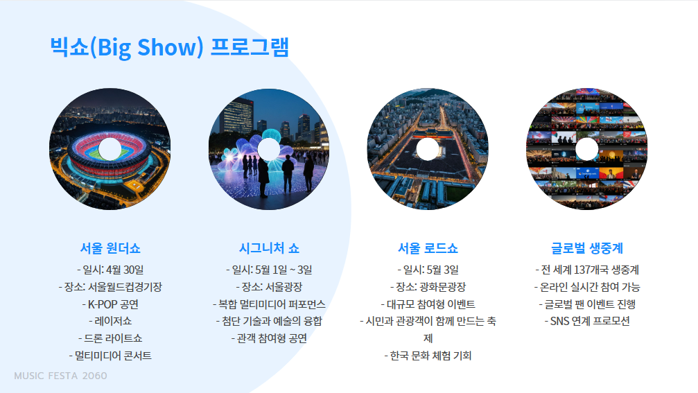 서울 스프링 페스타의 하이라이트는 바로 빅쇼(Big Show)입니다. 국내외 팬들이 가장 기다리는 K-POP 공연과 첨단 기술이 결합된 멀티미디어 퍼포먼스가 펼쳐질 예정입니다.