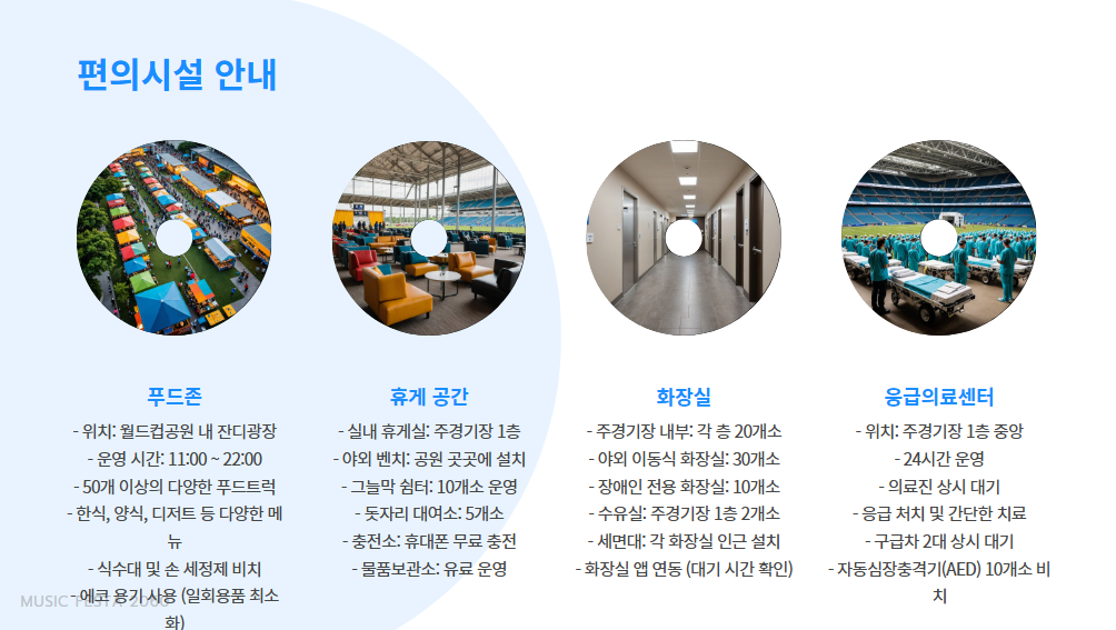 행사장 내에는 푸드존과 휴게 공간이 마련되어 있으며, 화장실 및 응급의료센터도 운영됩니다.