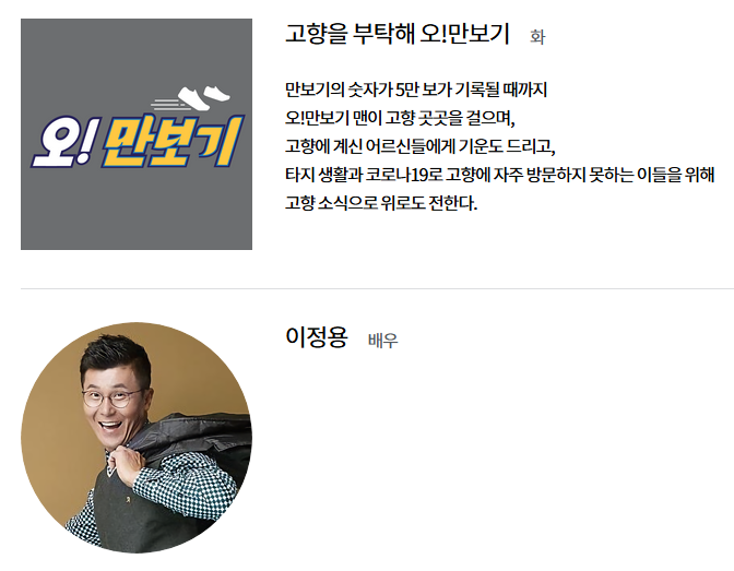 '오! 만보기'는 '고향을 부탁해'라는 특별한 주제로 진행되는 매력적인 걷기 여행 프로그램입니다. 전국의 숨은 보석 같은 걷기 명소들을 찾아가 소개하며, 현대인의 건강한 삶을 위한 걷기 운동의 중요성을 자연스럽게 강조합니다.